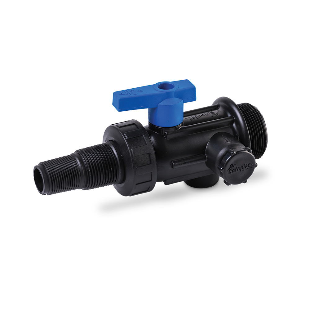 Multiconector con válvula esfera y tuerca union rotoplas. Permite la limpieza y lavado de tinaco, evitando cualquier tipo de fuga, integrando 8 piezas en 1.